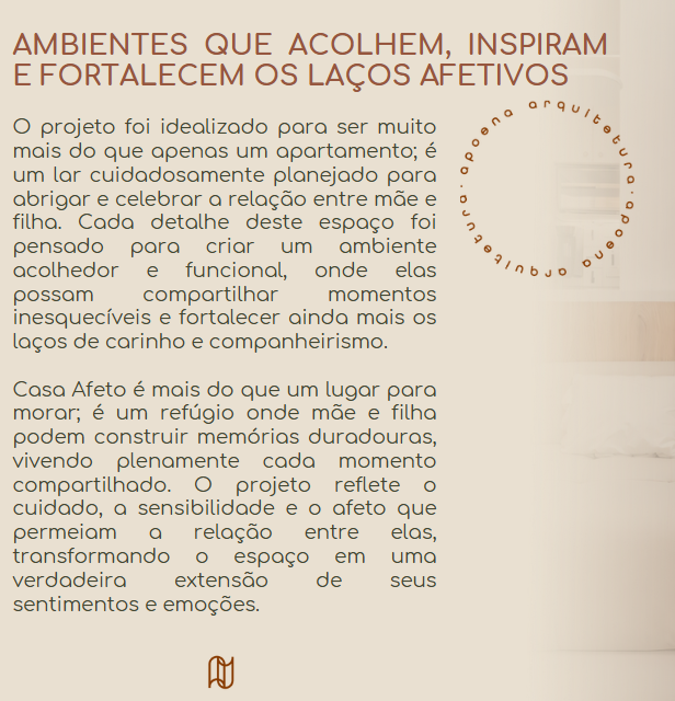 Casa Afeto é mais do que um lugar para morar; é um refúgio onde mãe e filha podem construir memórias duradouras, vivendo plenamente cada momento compartilhado. O projeto reflete o cuidado, a sensibilidade e o afeto que permeiam a relação entre elas, transformando o espaço em uma verdadeira extensão de seus sentimentos e emoções.